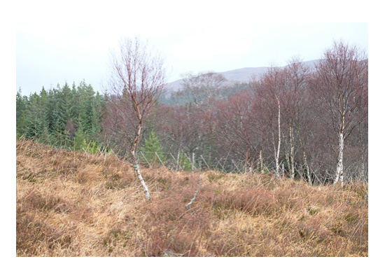 Beyond the fence, to my left, I could see the sparse woodland rising up the hill – mostly old birch trees with new patches of birch stands dotted around.